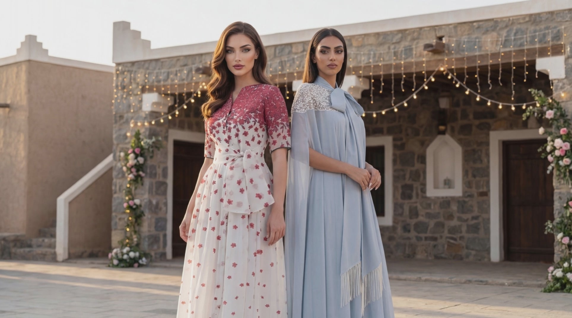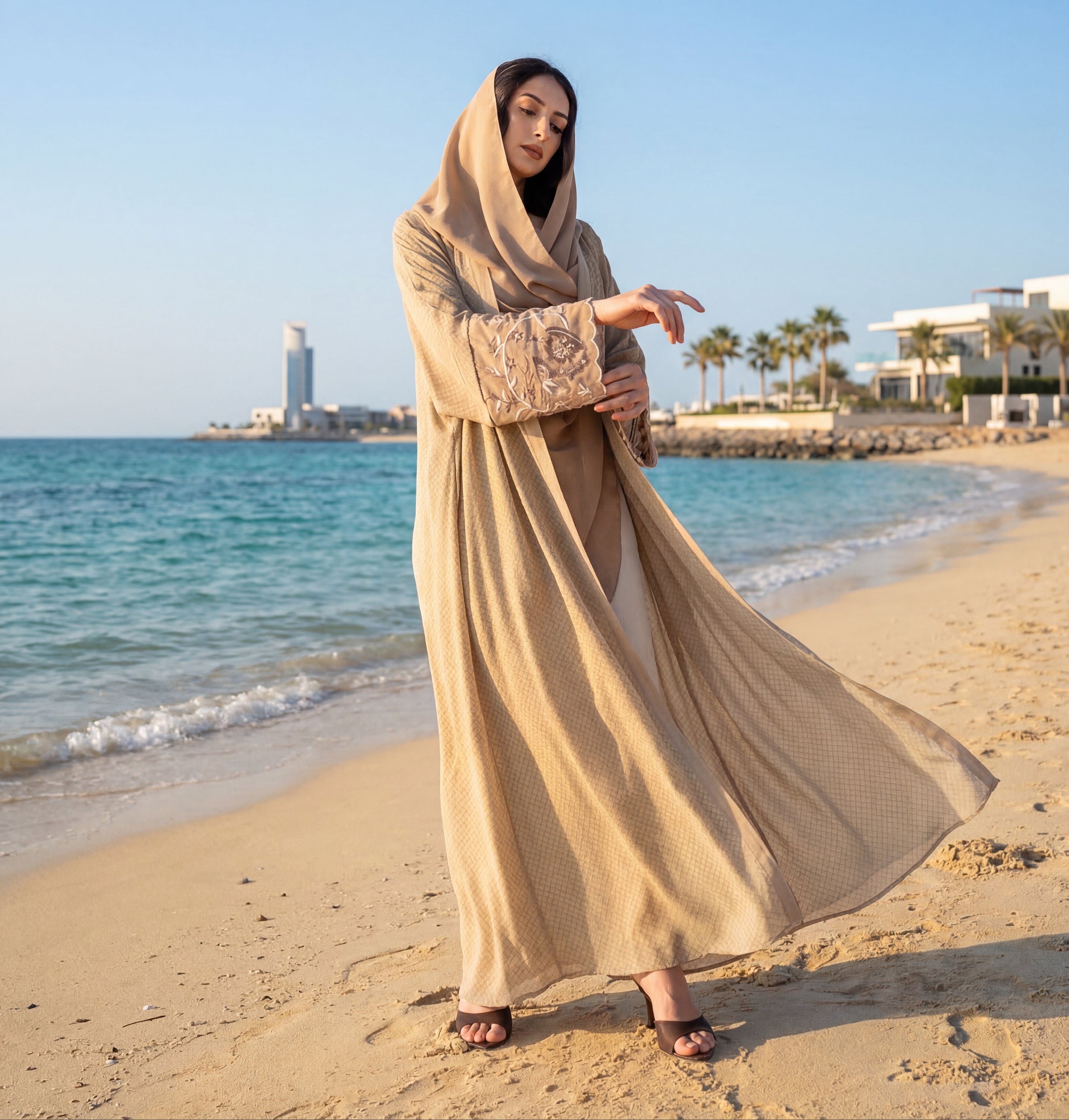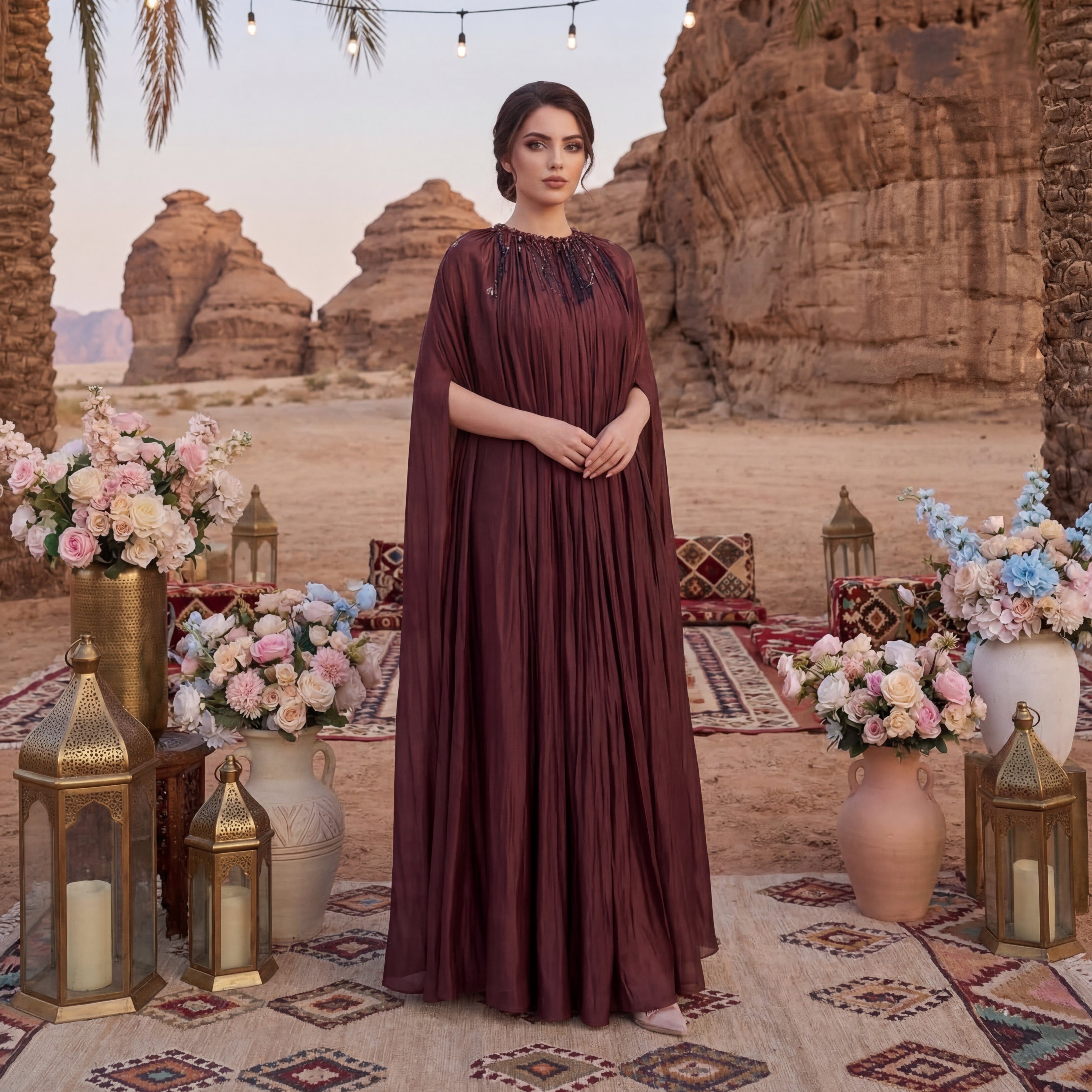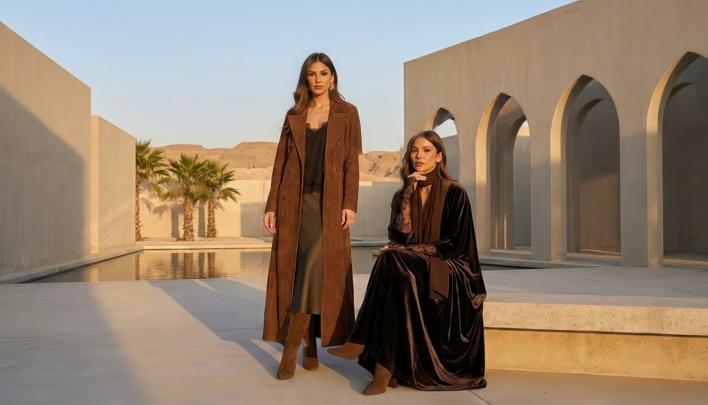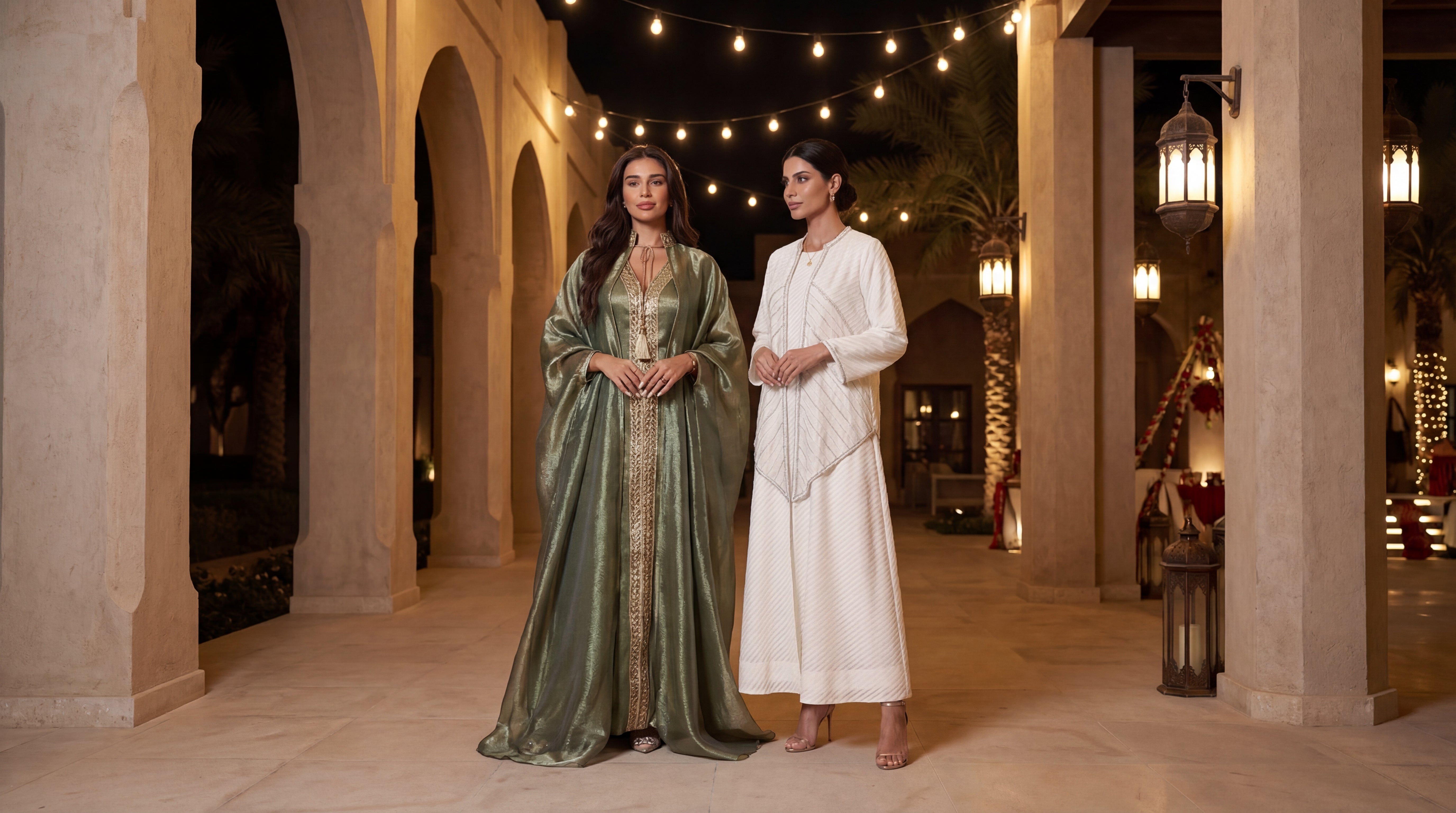 We curate contemporary abayas, kaftans, and statement pieces that blend Saudi heritage, bold color innovation, and architecture‑inspired prints with effortless holiday style.