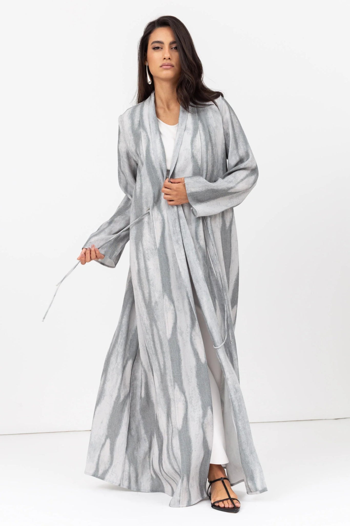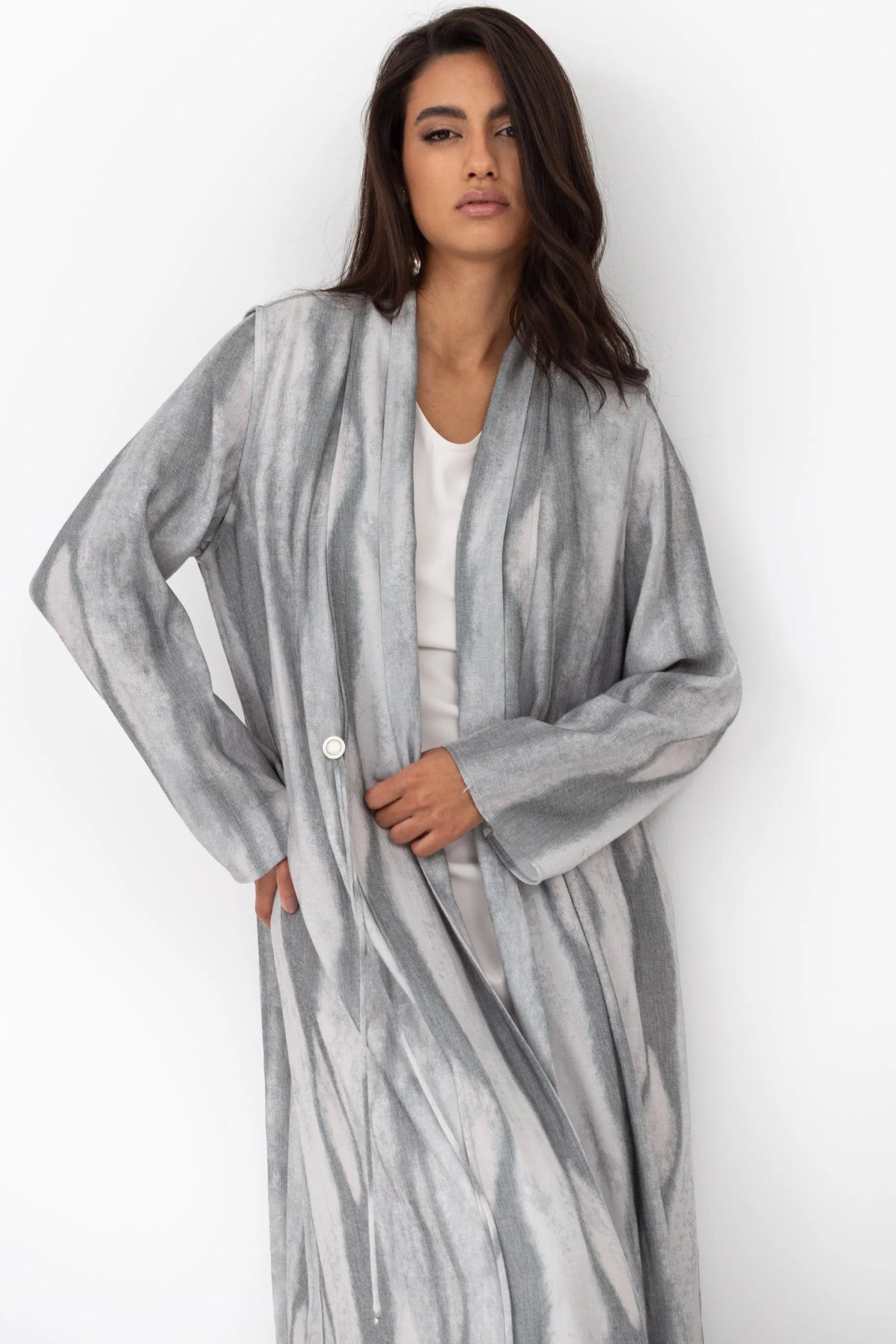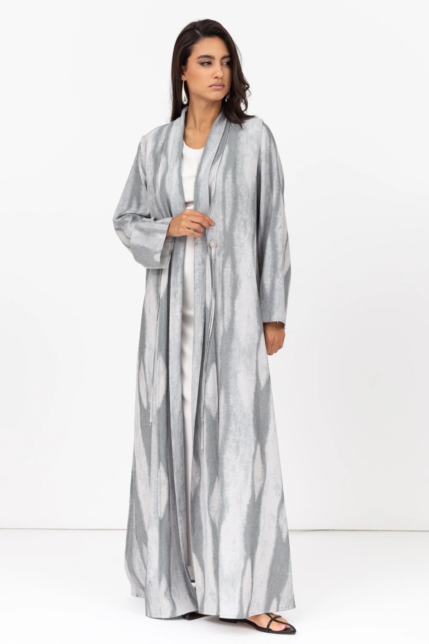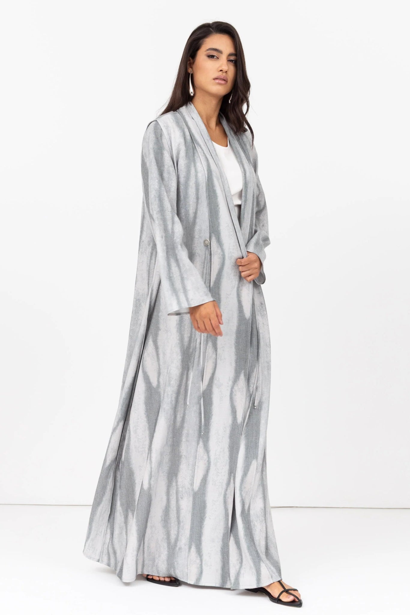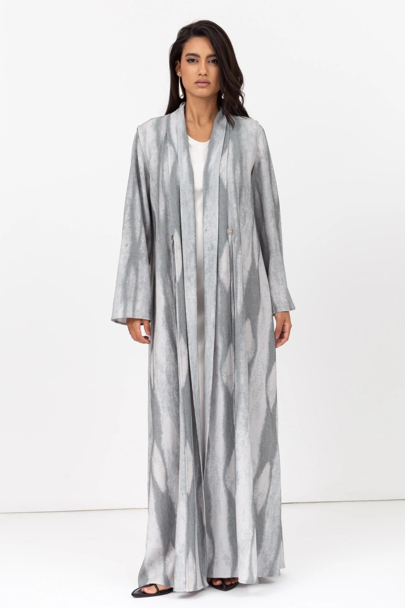 A refined abaya crafted from sustainable Tencel-linen blend, featuring a soft shawl collar and traditional taseel-button detailing, merging modern cuts with heritage accents.