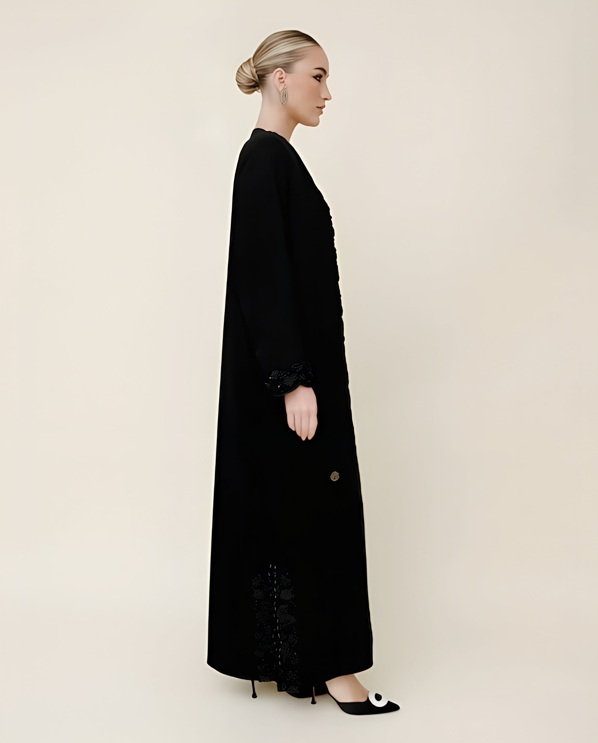 A timeless black silk abaya enriched with exquisite embroidery along the neckline and sleeves. Its smooth texture and subtle shimmer create a look of understated luxury — ideal for formal gatherings and special evenings.