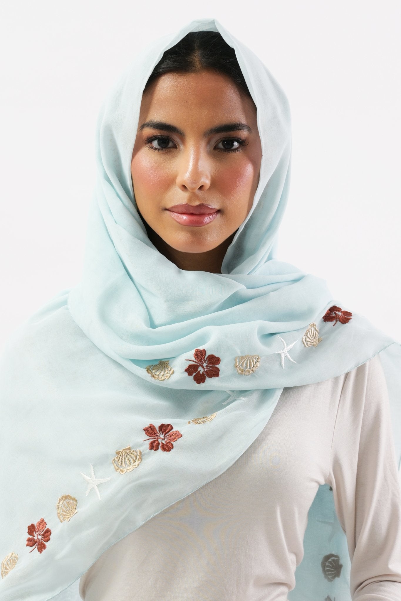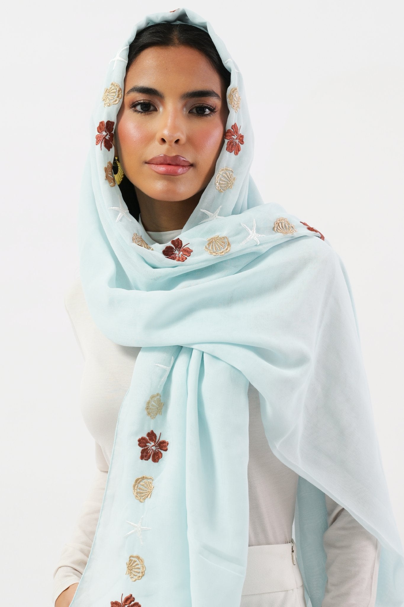 Made of voile, this lightweight scarf features delicate shell flower and starfish embroidery that adds a touch of elegance to any outfit.