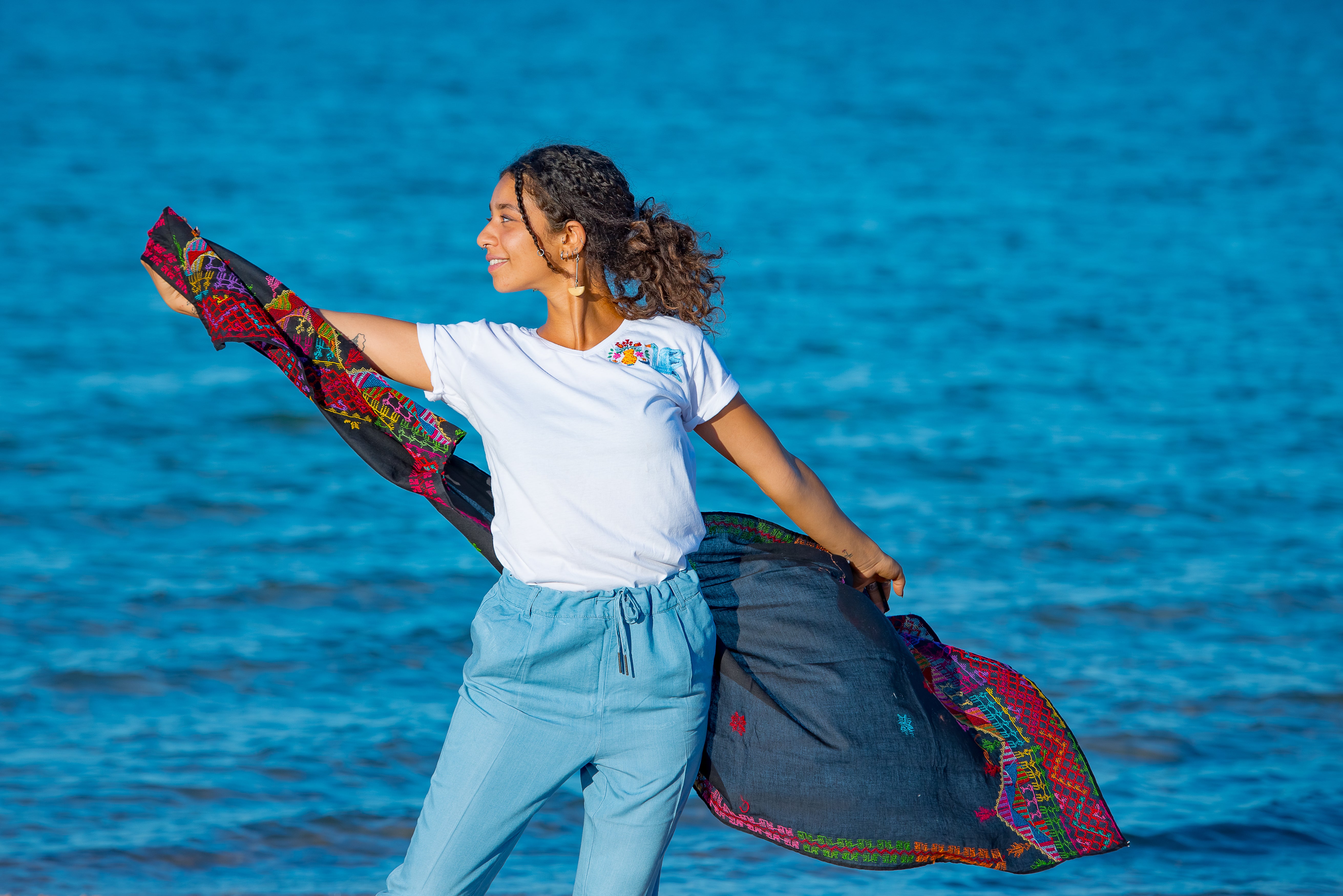 A scarf featuring the traditional bedouin cross stitch from Sinai. This traditional stitch is familiar accross the Levant in historically nomadic tribes. Each piece is unique due to the fact that they are hand embroidered by different women artisans.