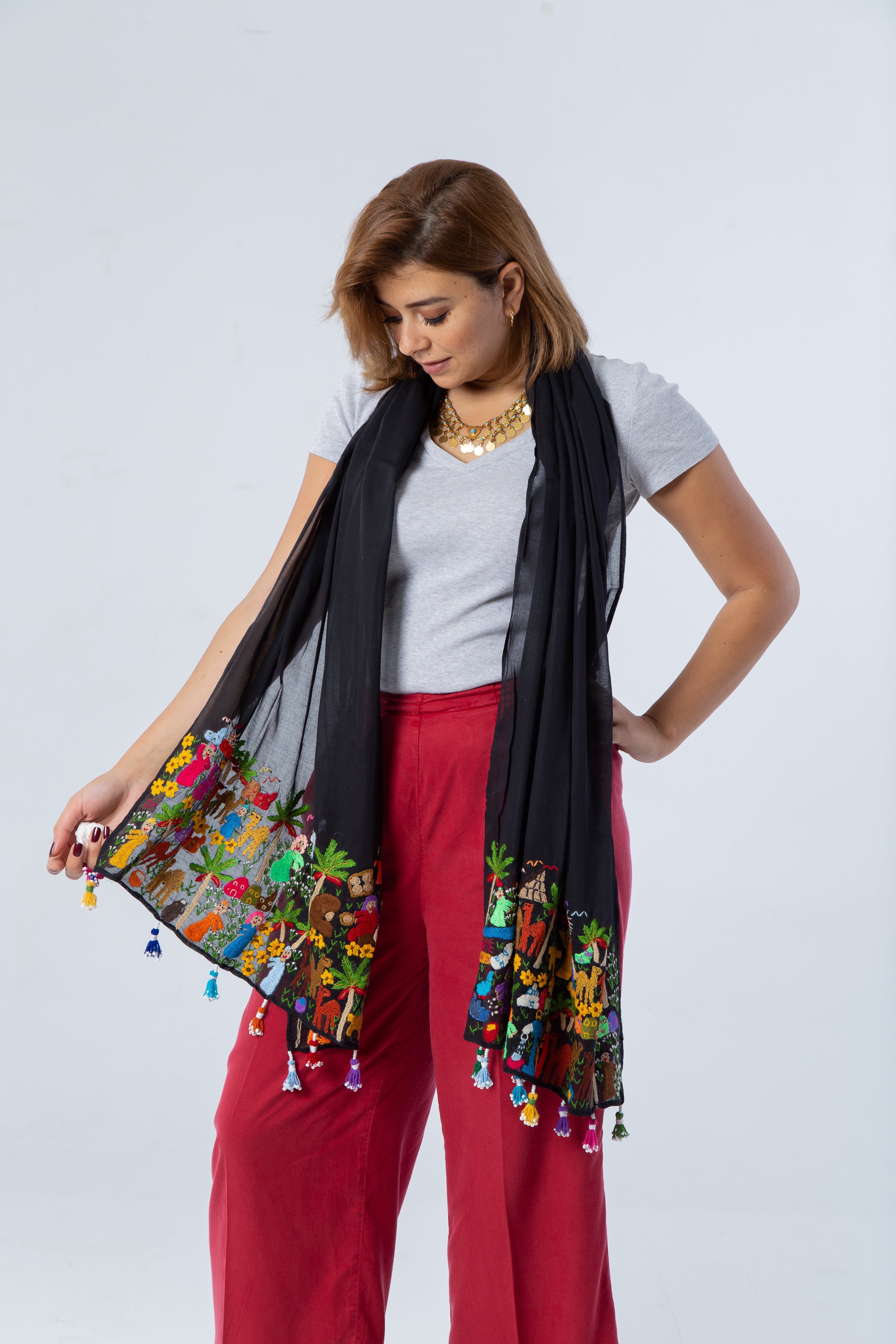 A unique hand embroidered scarf on 100% Egyptian cotton featuring Nevin Altmann's Fellahy design. The Fellahy design is our own unique contemporary hand embroidery design. It depicts scenes from the Nile Delta, the Egyptian countryside.