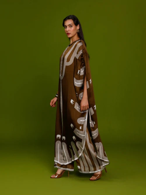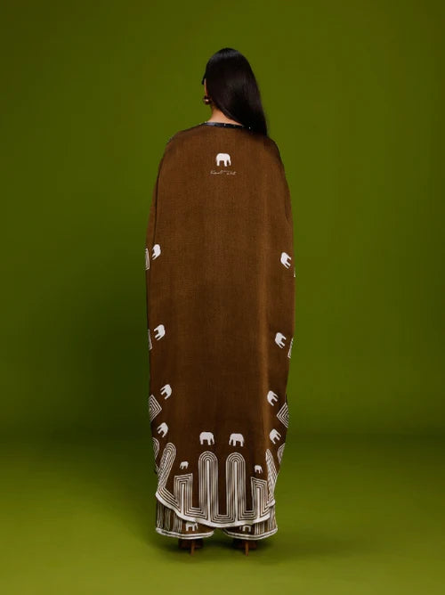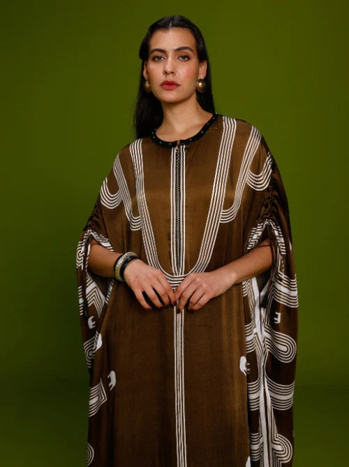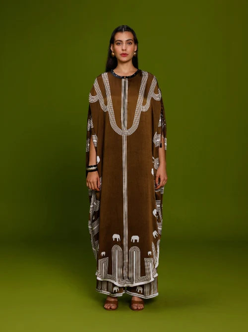 A straight-cut maxi dress featuring traditional-inspired placement prints and contrast detailing along the neckline and hem. The relaxed fit and breathable fabric ensure all-day comfort, while the vertical paneling enhances the overall structure and flow.