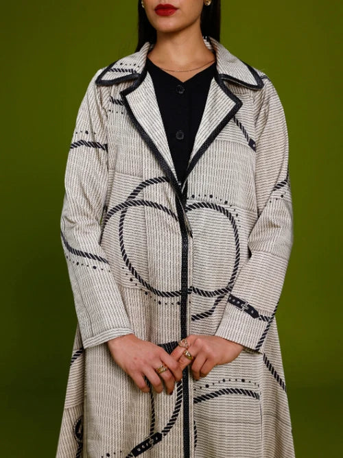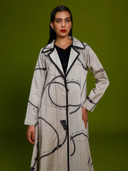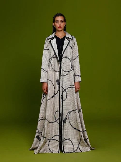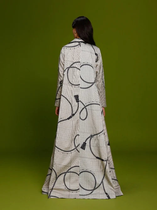 A floor-length, front-open jacket-style dress layered over a solid inner. Featuring structured lapels, contrast piping, and bold graphic prints, this piece creates a strong, elongated silhouette. Designed for formal and festive styling, it blends tailoring with fluidity.