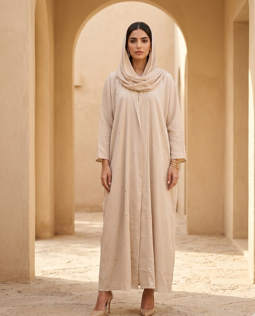 Crepe abaya adorned with intricate beadwork and paired with a matching scarf, offering a graceful silhouette with subtle shimmer for an elegant and polished look.