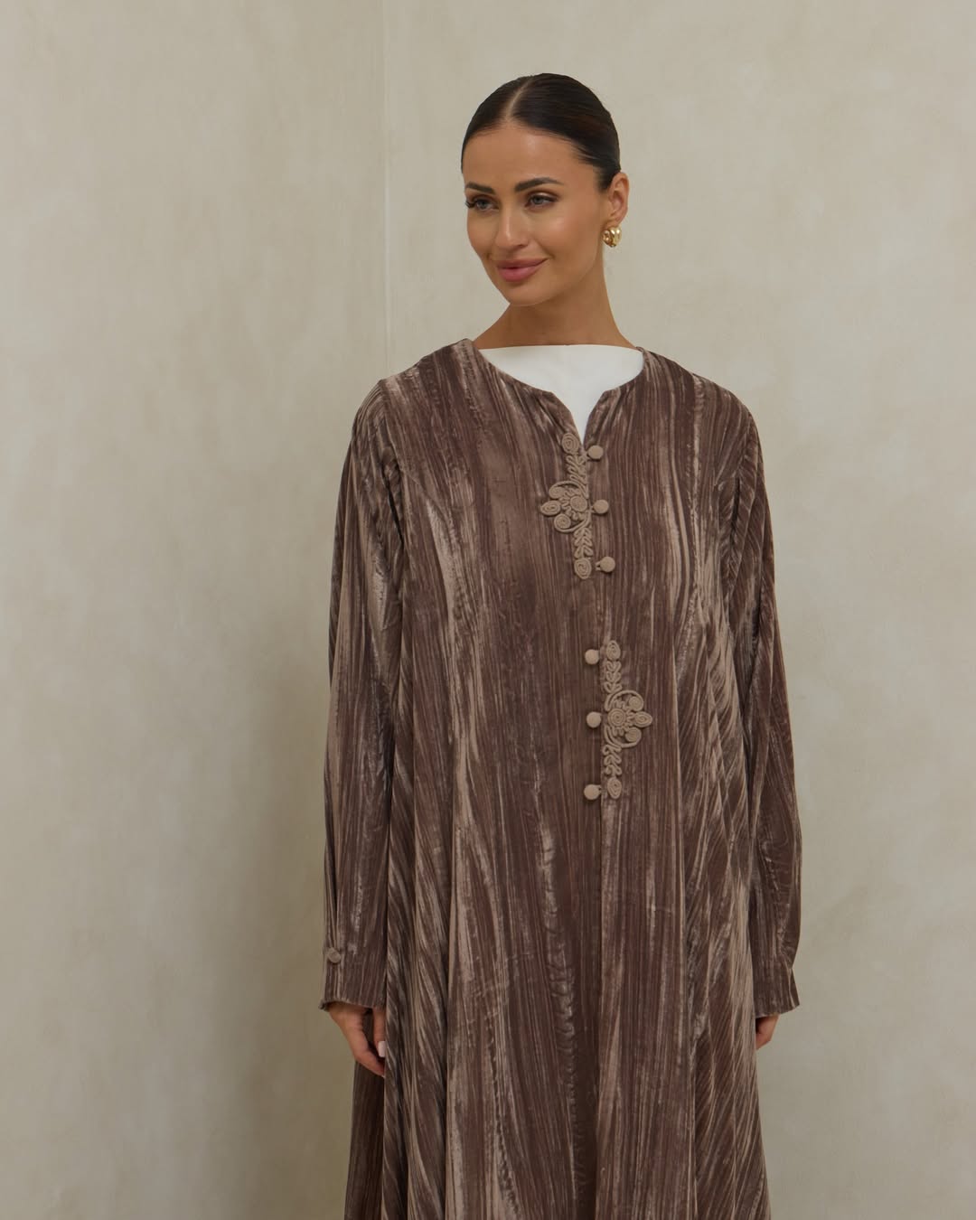 An elegant velvet abaya, crafted from soft velvet with subtle shimmering lines that add luxury and fluidity to the design. The front is adorned with handcrafted Moroccan-style decorative buttons, giving the abaya a refined traditional touch that balances simplicity and sophistication.