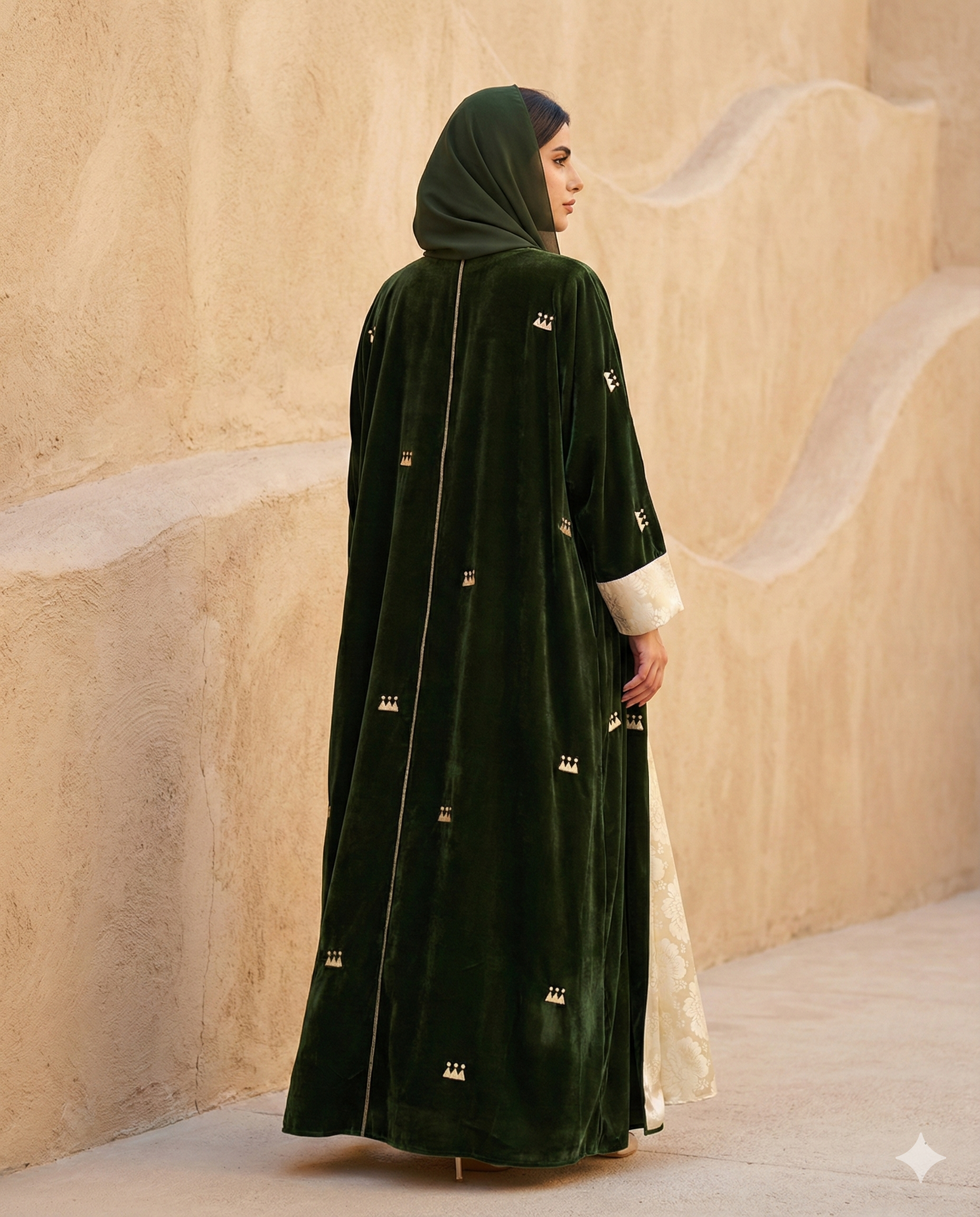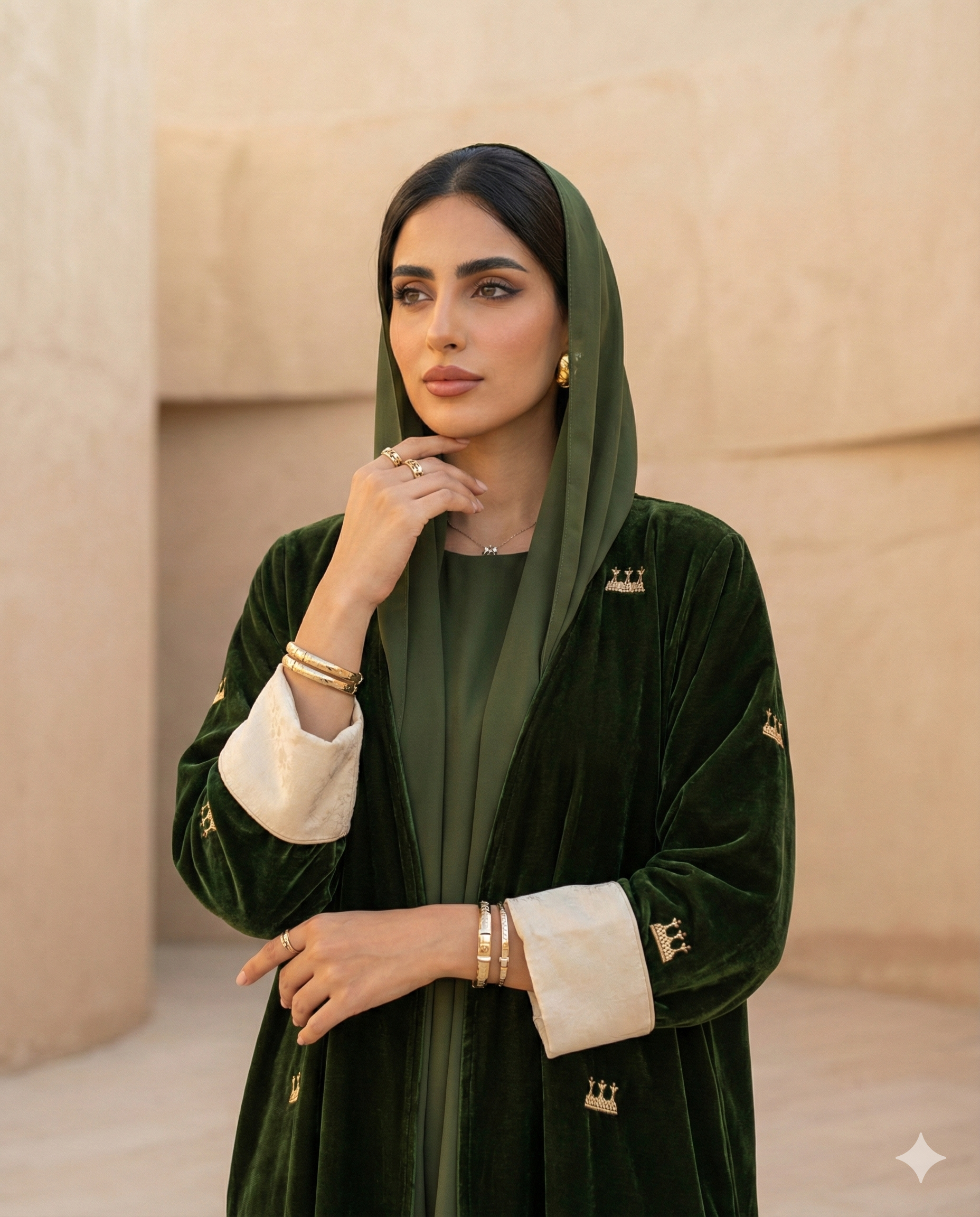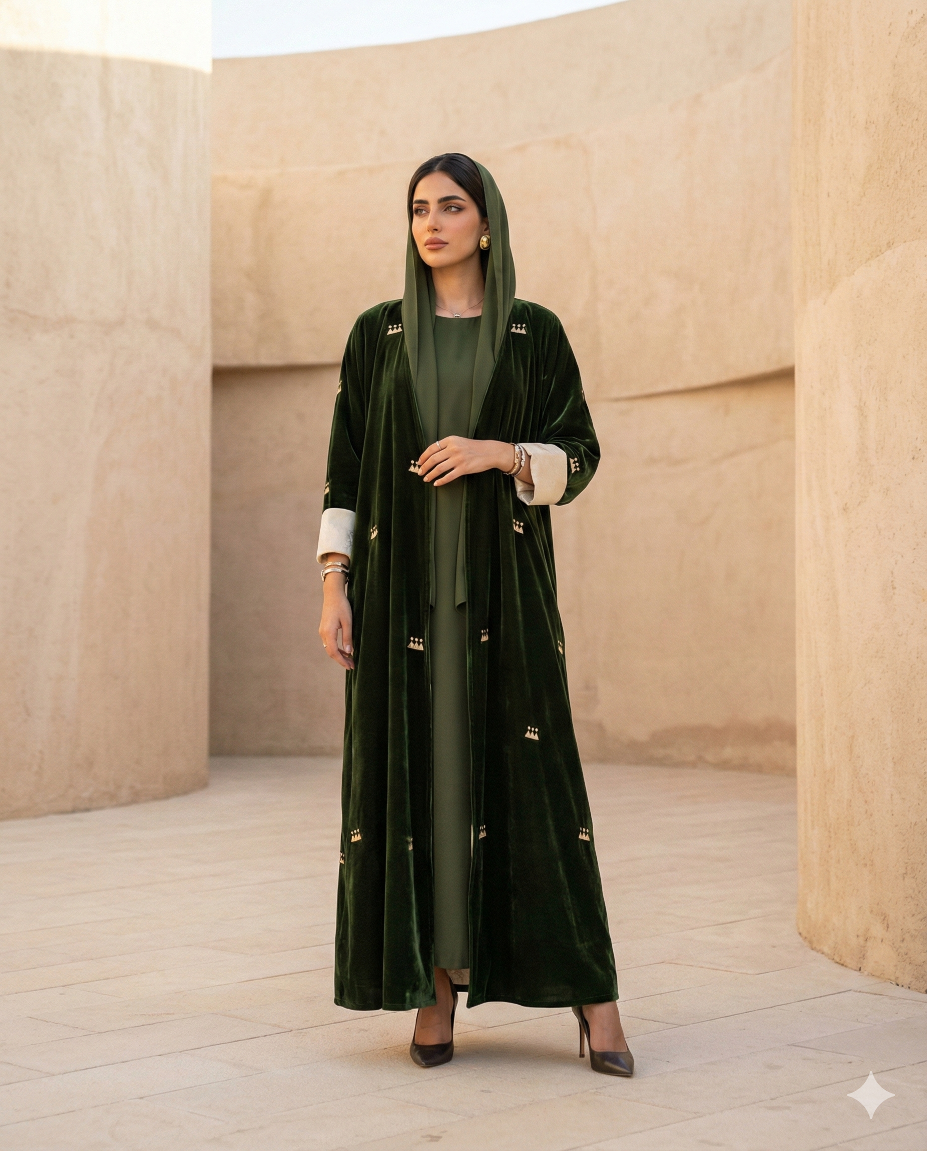 We curate contemporary abayas, kaftans, and statement pieces that blend Saudi heritage, bold color innovation, and architecture‑inspired prints with effortless holiday style.
