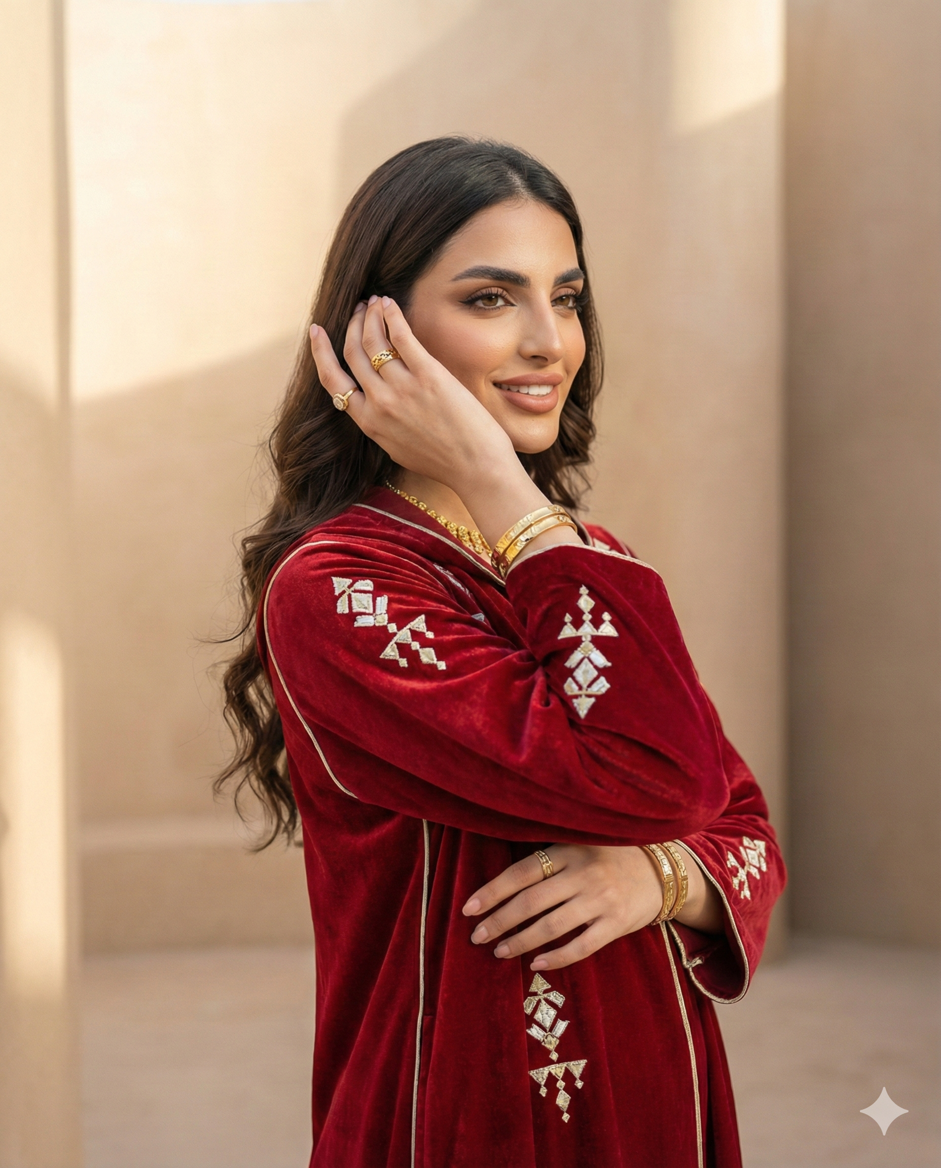 We curate contemporary abayas, kaftans, and statement pieces that blend Saudi heritage, bold color innovation, and architecture‑inspired prints with effortless holiday style.
