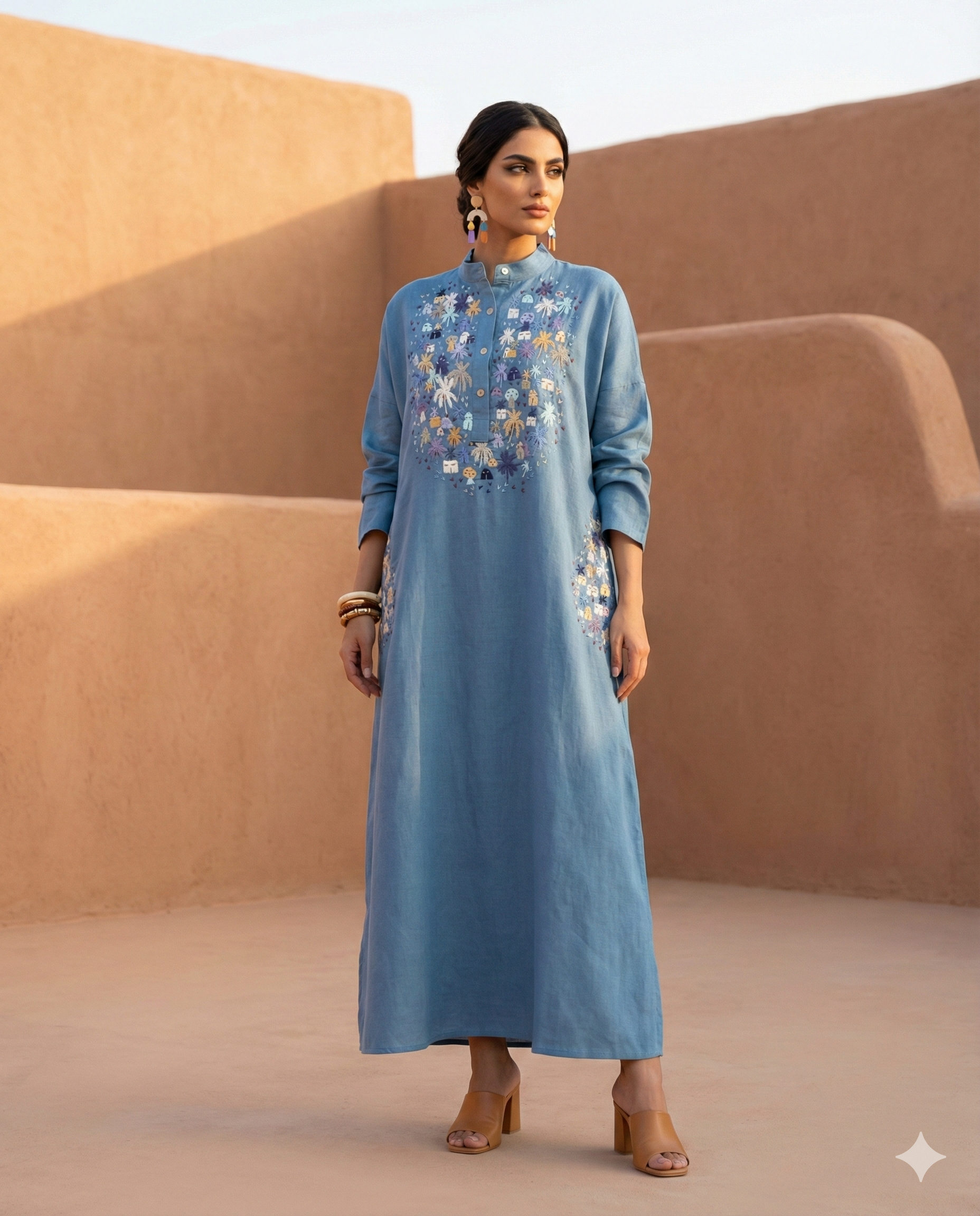 We curate contemporary abayas, kaftans, and statement pieces that blend Saudi heritage, bold color innovation, and architecture‑inspired prints with effortless holiday style.