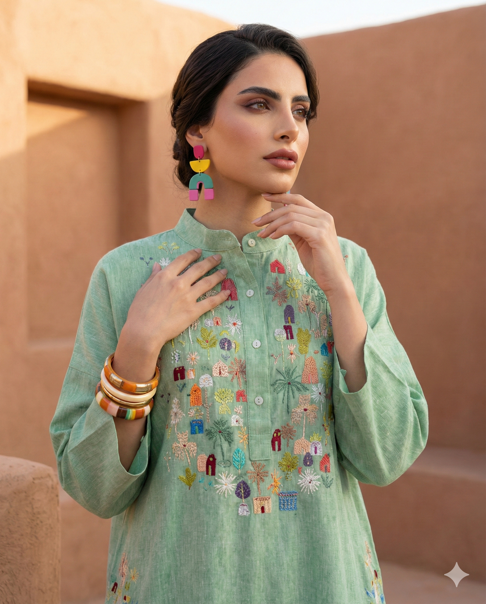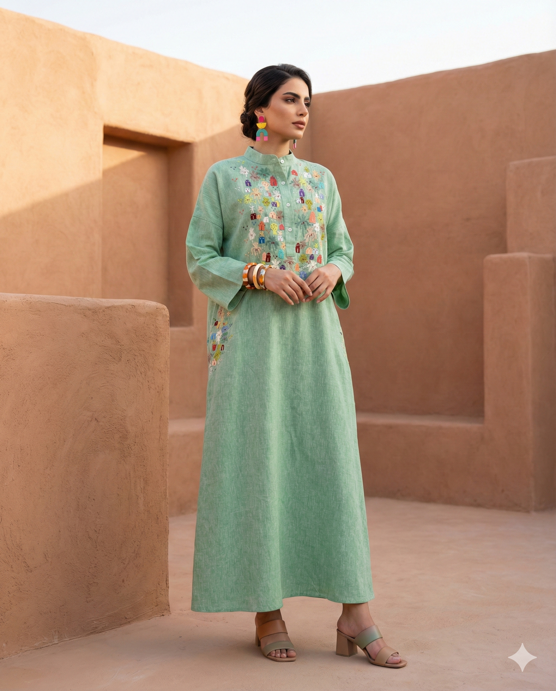 We curate contemporary abayas, kaftans, and statement pieces that blend Saudi heritage, bold color innovation, and architecture‑inspired prints with effortless holiday style.