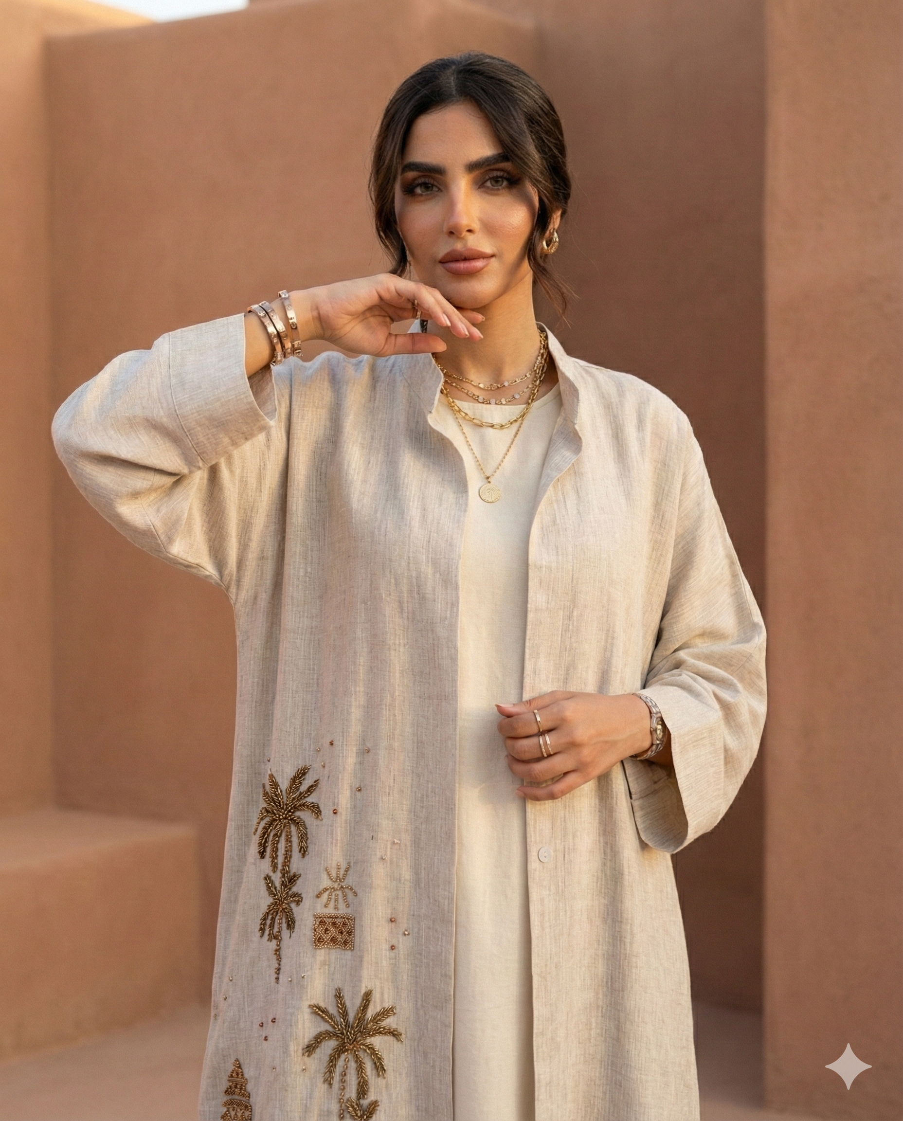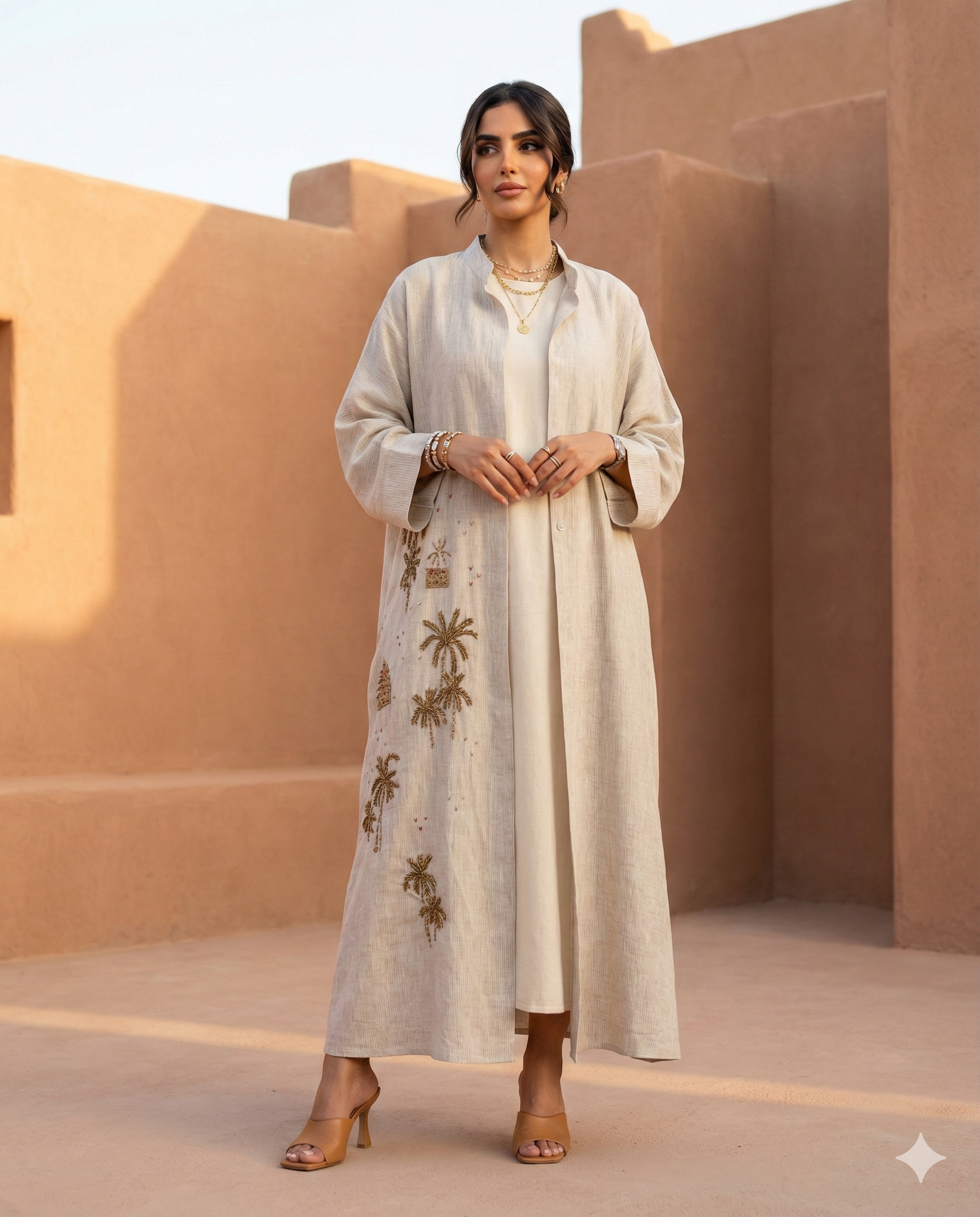 We curate contemporary abayas, kaftans, and statement pieces that blend Saudi heritage, bold color innovation, and architecture‑inspired prints with effortless holiday style.