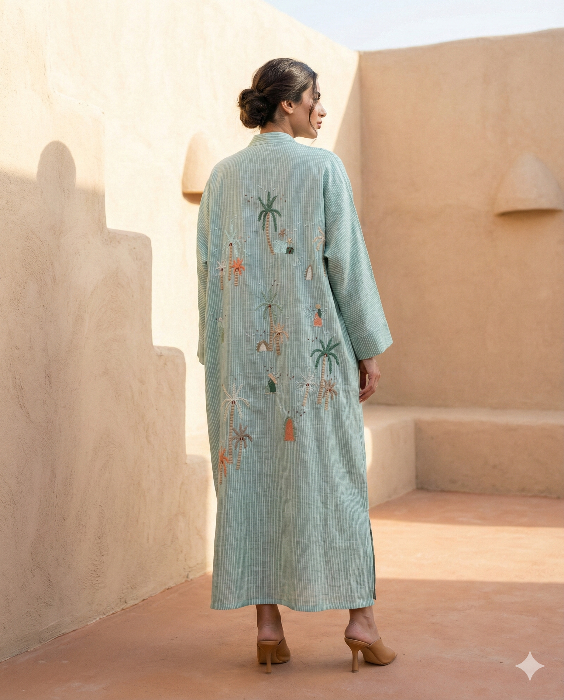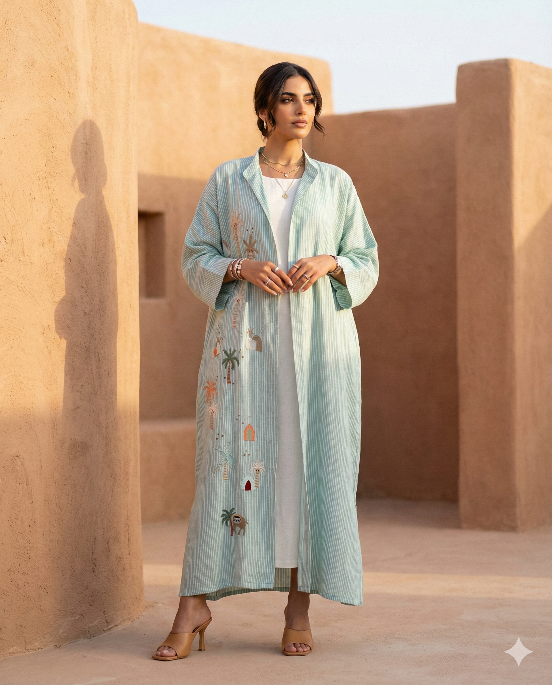 We curate contemporary abayas, kaftans, and statement pieces that blend Saudi heritage, bold color innovation, and architecture‑inspired prints with effortless holiday style.