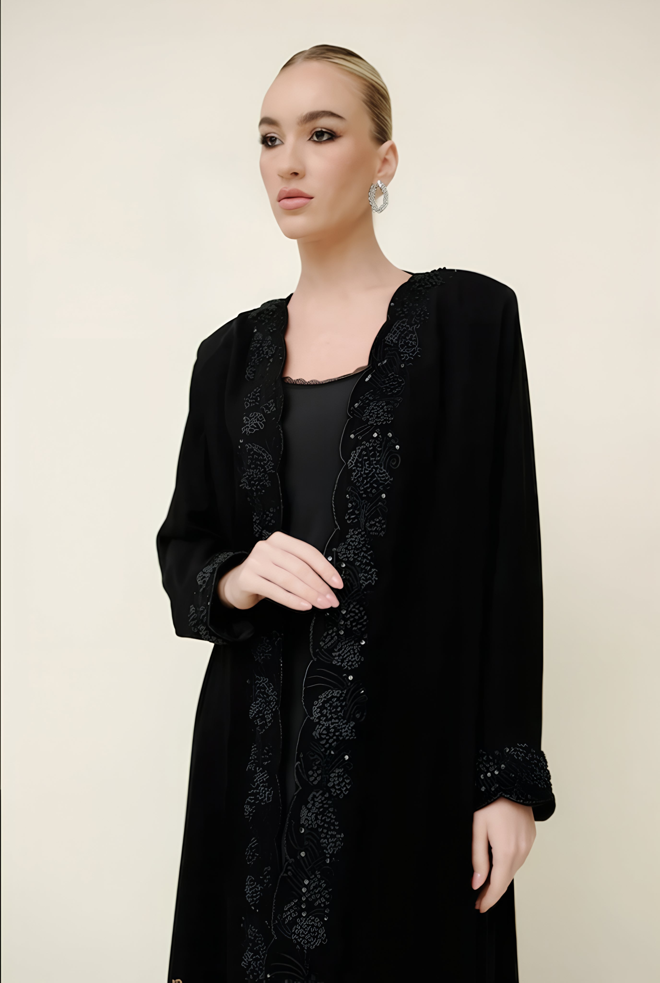 A timeless black silk abaya enriched with exquisite embroidery along the neckline and sleeves. Its smooth texture and subtle shimmer create a look of understated luxury — ideal for formal gatherings and special evenings.