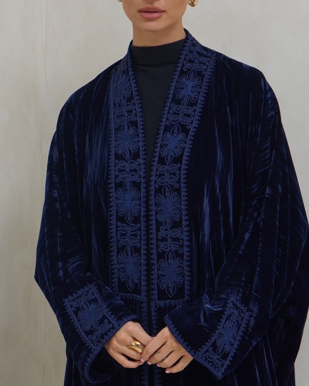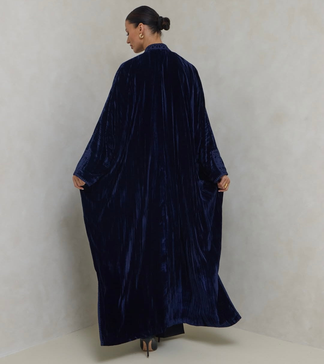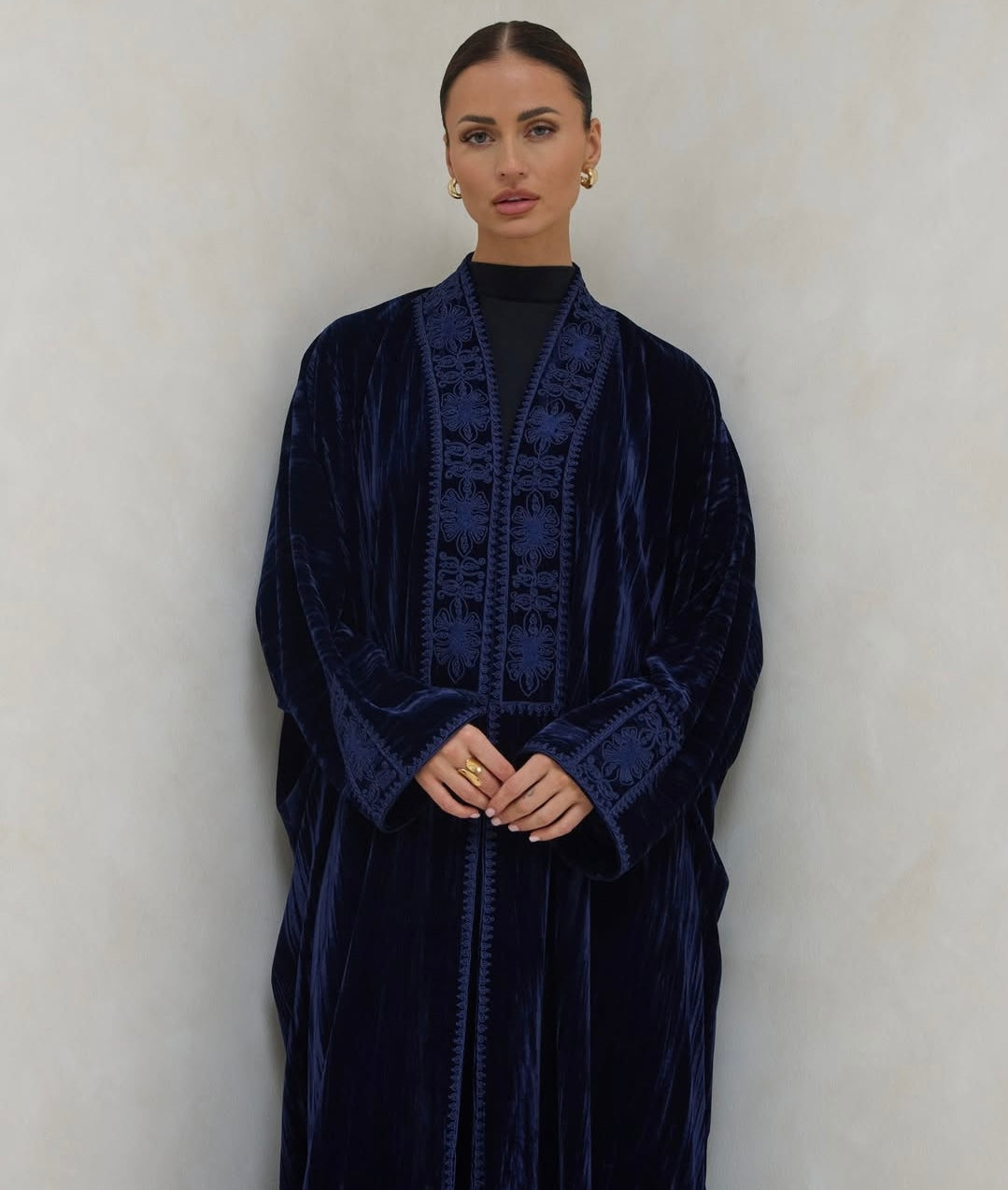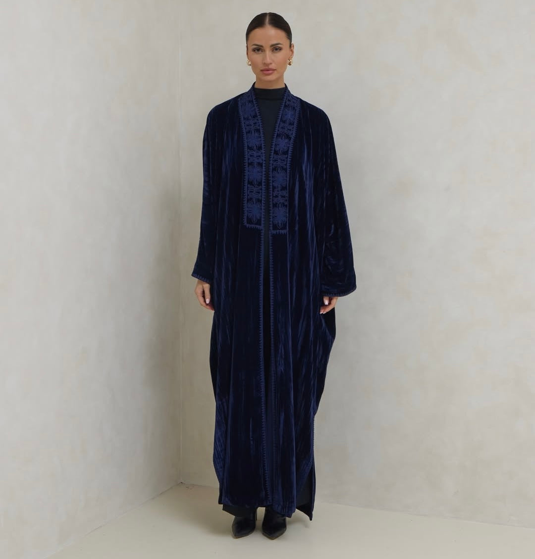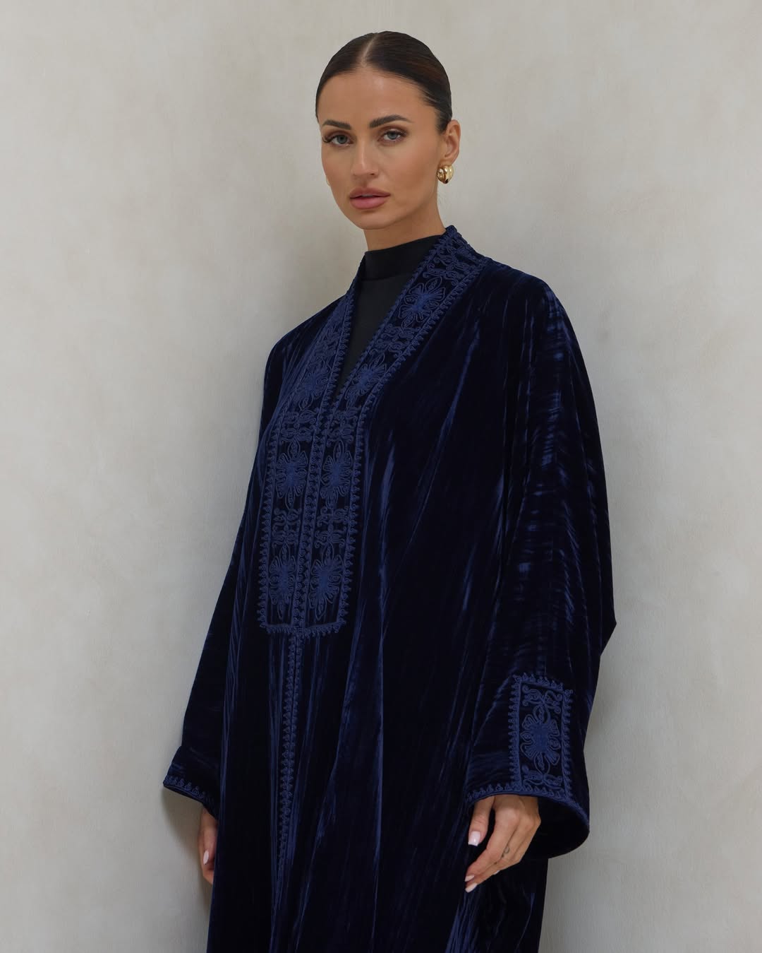 Stand out with a luxurious and elegant look in this soft velvet abaya, adorned with exquisite hand embroidery on the front and sleeves, combining authentic Moroccan craftsmanship with elegant Arabic embroidery. Its design blends luxury and comfort, giving you a distinctive look for any occasion.