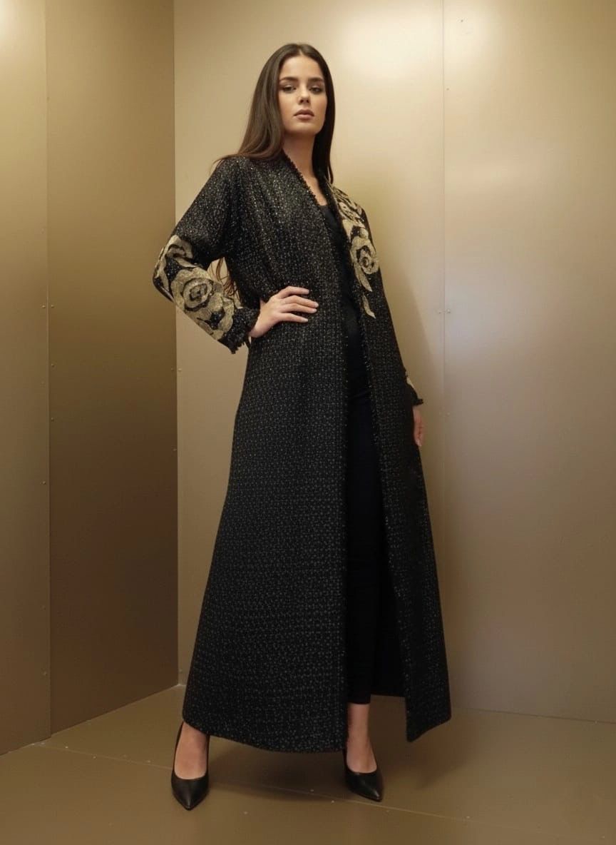 Black Wool Farwa – A refined black wool farwa crafted with a sleek silhouette, offering timeless warmth, elegance, and sophistication.