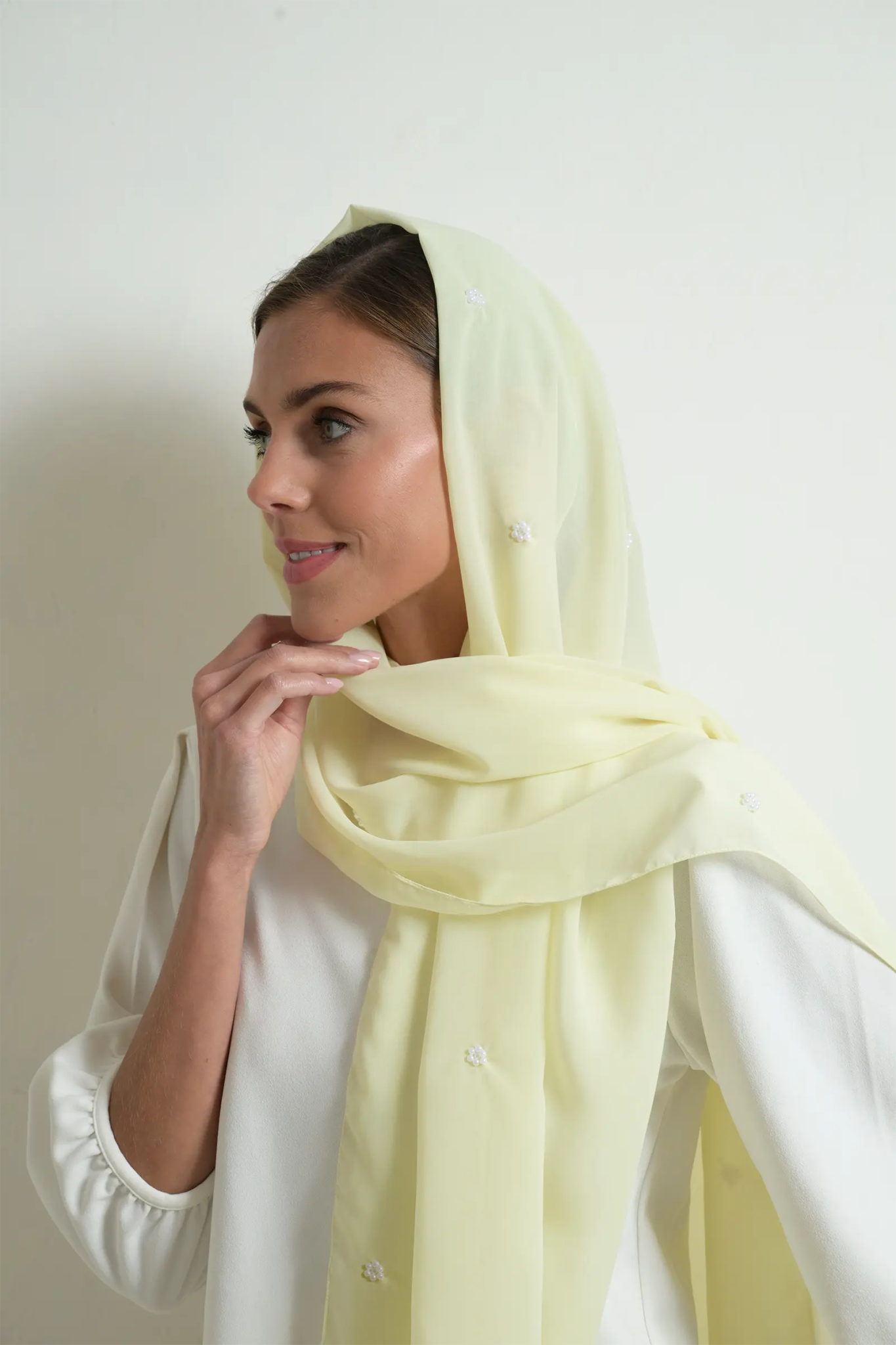 A luminous yellow voile scarf adorned with delicate pearl accents—bold yet subtly feminine.