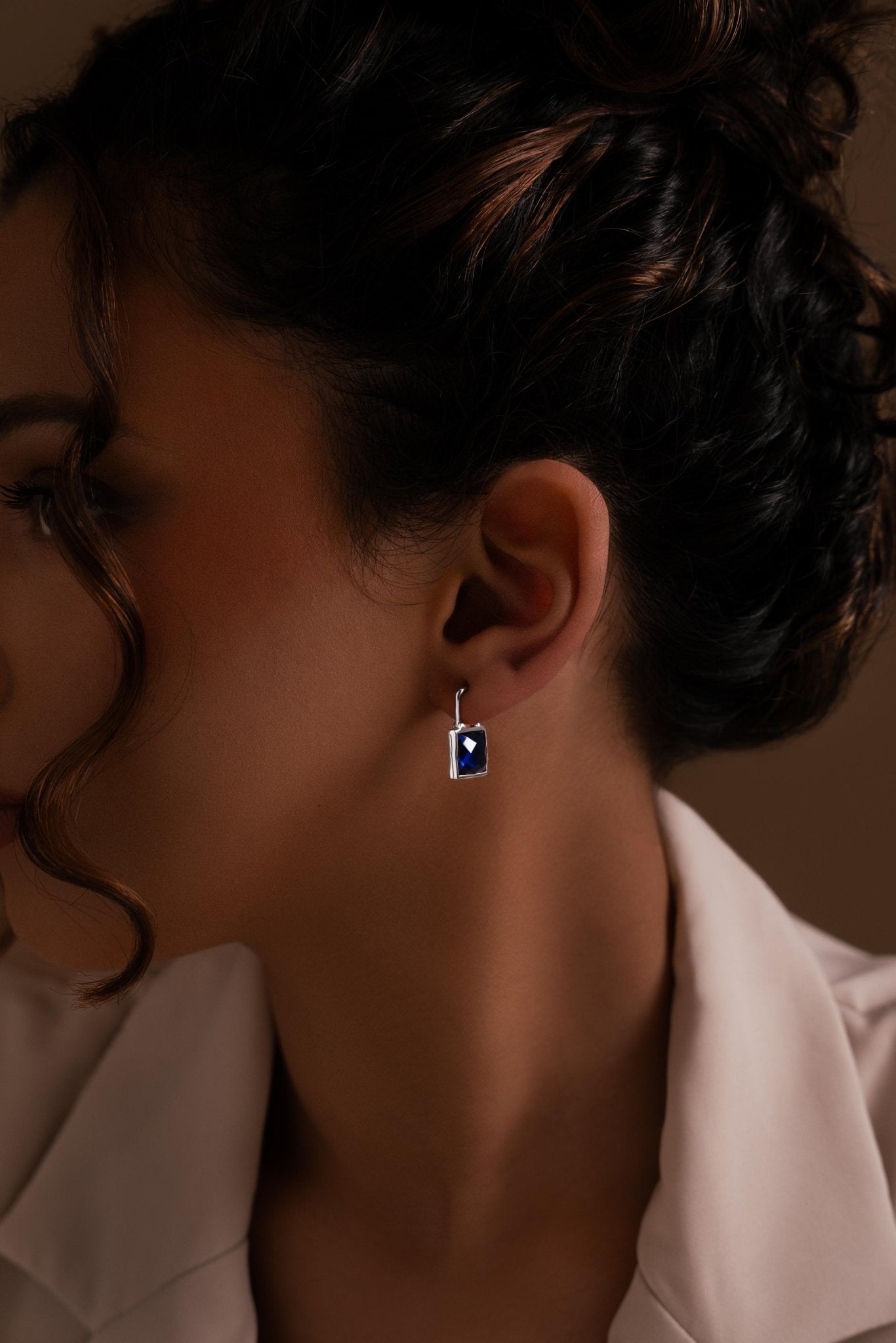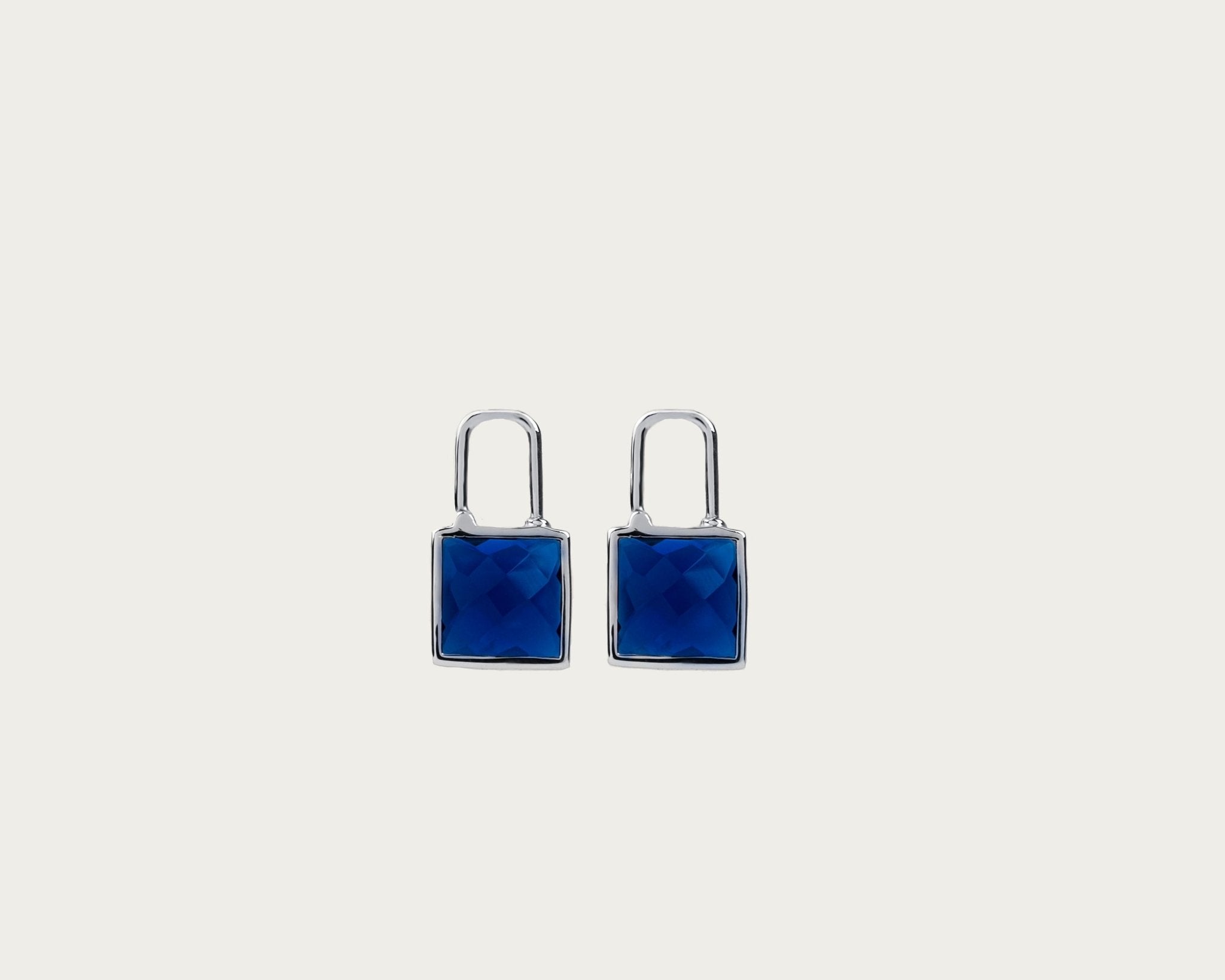 Self-lock Earrings in silver-rhodium with blue CZ, refined edge in rhodium over 925 recycled silver.
