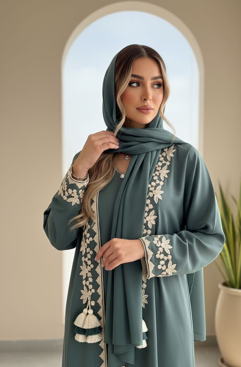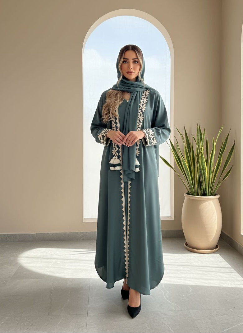 Elegant and timeless, this green crepe abaya is crafted from premium crepe that drapes beautifully with every movement. Its minimalist silhouette makes it a versatile piece, perfect for both formal occasions and everyday wear.